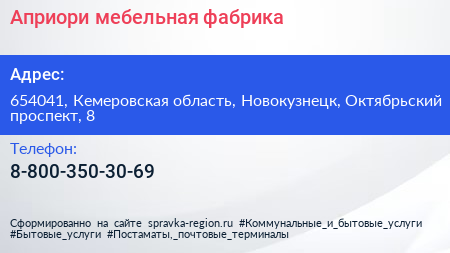 Априори, мебельная фабрика по адресу 654041, Кемеровская область, Новокузнецк, Октябрьский проспект, 8 в дальнейшем Организация, размещена в следующих категориях: