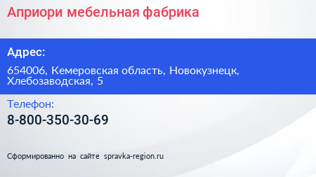 Априори, мебельная фабрика по адресу 654006, Кемеровская область, Новокузнецк, Хлебозаводская, 5 в дальнейшем Организация, размещена в следующих категориях: