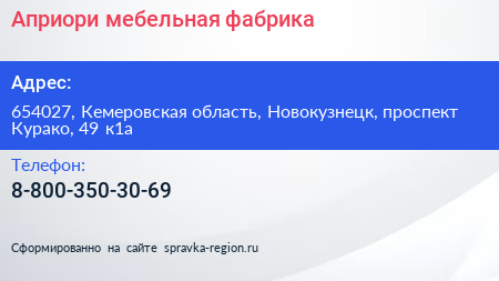 Априори, мебельная фабрика по адресу 654027, Кемеровская область, Новокузнецк, проспект Курако, 49 к1а в дальнейшем Организация, размещена в следующих категориях: