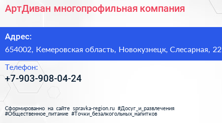 АртДиван, многопрофильная компания по адресу 654002, Кемеровская область, Новокузнецк, Слесарная, 22 в дальнейшем Организация, размещена в следующих категориях: