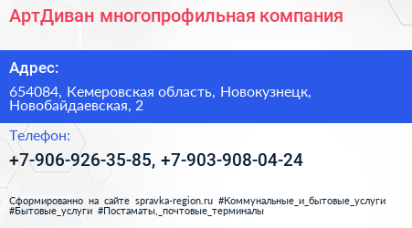 АртДиван, многопрофильная компания по адресу 654084, Кемеровская область, Новокузнецк, Новобайдаевская, 2 в дальнейшем Организация, размещена в следующих категориях: