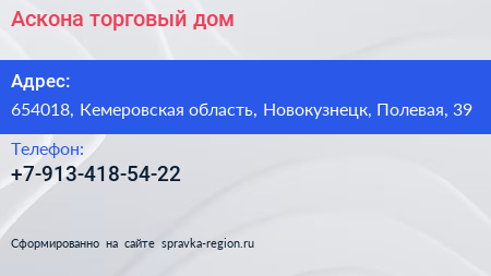 Аскона, торговый дом по адресу 654018, Кемеровская область, Новокузнецк, Полевая, 39 в дальнейшем Организация, размещена в следующих категориях: