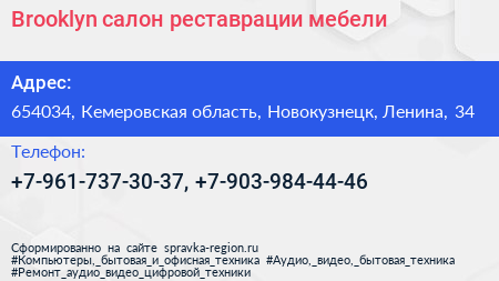 Brooklyn, салон реставрации мебели по адресу 654034, Кемеровская область, Новокузнецк, Ленина, 34 в дальнейшем Организация, размещена в следующих категориях: