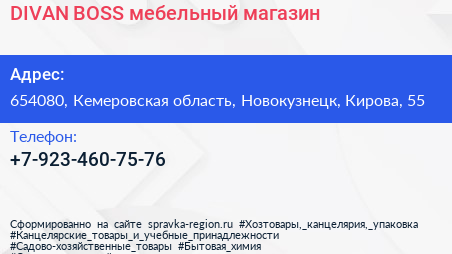 DIVAN BOSS, мебельный магазин по адресу 654080, Кемеровская область, Новокузнецк, Кирова, 55 в дальнейшем Организация, размещена в следующих категориях: