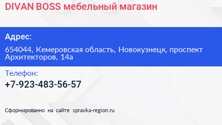 DIVAN BOSS, мебельный магазин по адресу 654044, Кемеровская область, Новокузнецк, проспект Архитекторов, 14а в дальнейшем Организация, размещена в следующих категориях: