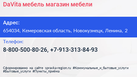 DaVita-мебель, магазин мебели по адресу 654034, Кемеровская область, Новокузнецк, Ленина, 2 в дальнейшем Организация, размещена в следующих категориях: