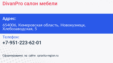 DivanPro, салон мебели по адресу 654006, Кемеровская область, Новокузнецк, Хлебозаводская, 5 в дальнейшем Организация, размещена в следующих категориях: