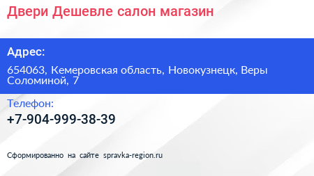 Двери Дешевле, салон-магазин по адресу 654063, Кемеровская область, Новокузнецк, Веры Соломиной, 7 в дальнейшем Организация, размещена в следующих категориях: