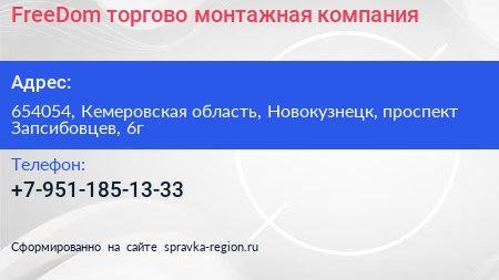 FreeDom, торгово-монтажная компания по адресу 654054, Кемеровская область, Новокузнецк, проспект Запсибовцев, 6г в дальнейшем Организация, размещена в следующих категориях: