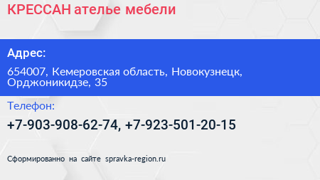 КРЕССАН, ателье мебели по адресу 654007, Кемеровская область, Новокузнецк, Орджоникидзе, 35 в дальнейшем Организация, размещена в следующих категориях: