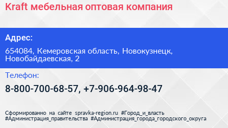 Kraft, мебельная оптовая компания по адресу 654084, Кемеровская область, Новокузнецк, Новобайдаевская, 2 в дальнейшем Организация, размещена в следующих категориях: