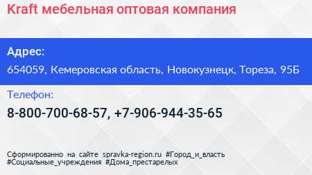 Kraft, мебельная оптовая компания по адресу 654059, Кемеровская область, Новокузнецк, Тореза, 95Б в дальнейшем Организация, размещена в следующих категориях: