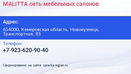 MALITTA, сеть мебельных салонов по адресу 654000, Кемеровская область, Новокузнецк, Транспортная, 85 в дальнейшем Организация, размещена в следующих категориях: