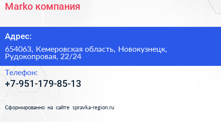 Marko, компания по адресу 654063, Кемеровская область, Новокузнецк, Рудокопровая, 22/24 в дальнейшем Организация, размещена в следующих категориях: