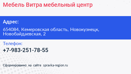 Мебель Витра, мебельный центр по адресу 654084, Кемеровская область, Новокузнецк, Новобайдаевская, 2 в дальнейшем Организация, размещена в следующих категориях: