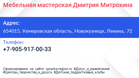 Мебельная мастерская Дмитрия Митрохина по адресу 654015, Кемеровская область, Новокузнецк, Ленина, 72 в дальнейшем Организация, размещена в следующих категориях: