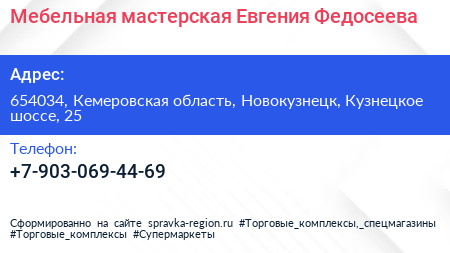 Мебельная мастерская Евгения Федосеева по адресу 654034, Кемеровская область, Новокузнецк, Кузнецкое шоссе, 25 в дальнейшем Организация, размещена в следующих категориях: