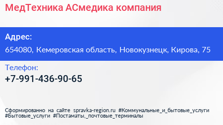МедТехника-АСмедика, компания по адресу 654080, Кемеровская область, Новокузнецк, Кирова, 75 в дальнейшем Организация, размещена в следующих категориях: