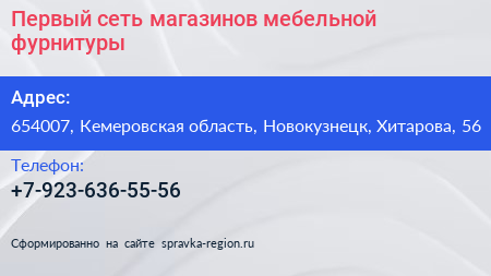 Первый, сеть магазинов мебельной фурнитуры по адресу 654007, Кемеровская область, Новокузнецк, Хитарова, 56 в дальнейшем Организация, размещена в следующих категориях: