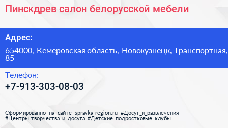 Пинскдрев, салон белорусской мебели по адресу 654000, Кемеровская область, Новокузнецк, Транспортная, 85 в дальнейшем Организация, размещена в следующих категориях: