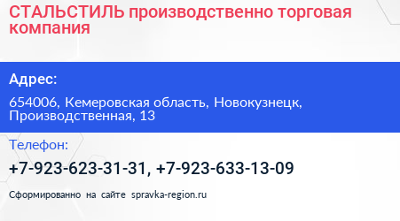 СТАЛЬСТИЛЬ, производственно-торговая компания по адресу 654006, Кемеровская область, Новокузнецк, Производственная, 13 в дальнейшем Организация, размещена в следующих категориях: