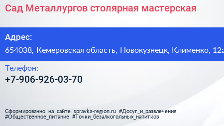 Сад Металлургов, столярная мастерская по адресу 654038, Кемеровская область, Новокузнецк, Клименко, 12а в дальнейшем Организация, размещена в следующих категориях: