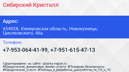 Сибирский Кристалл по адресу 654018, Кемеровская область, Новокузнецк, Циолковского, 46а в дальнейшем Организация, размещена в следующих категориях: