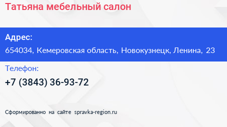 Татьяна, мебельный салон по адресу 654034, Кемеровская область, Новокузнецк, Ленина, 23 в дальнейшем Организация, размещена в следующих категориях: