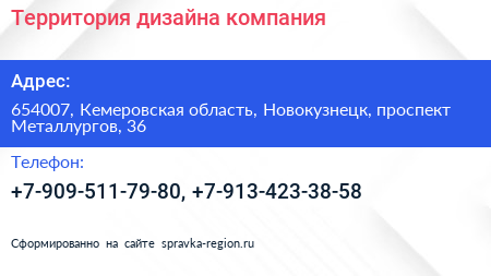 Территория дизайна, компания по адресу 654007, Кемеровская область, Новокузнецк, проспект Металлургов, 36 в дальнейшем Организация, размещена в следующих категориях: