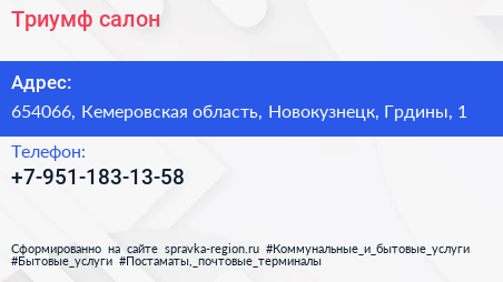 Триумф, салон по адресу 654066, Кемеровская область, Новокузнецк, Грдины, 1 в дальнейшем Организация, размещена в следующих категориях: