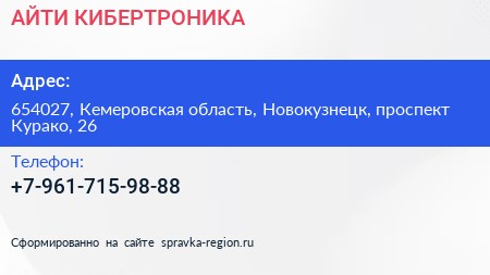 АЙТИ КИБЕРТРОНИКА по адресу 654027, Кемеровская область, Новокузнецк, проспект Курако, 26 в дальнейшем Организация, размещена в следующих категориях: