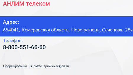 АНЛИМ телеком по адресу 654041, Кемеровская область, Новокузнецк, Сеченова, 28а в дальнейшем Организация, размещена в следующих категориях: