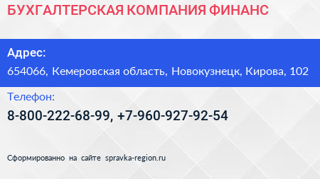 БУХГАЛТЕРСКАЯ КОМПАНИЯ-ФИНАНС по адресу 654066, Кемеровская область, Новокузнецк, Кирова, 102 в дальнейшем Организация, размещена в следующих категориях: