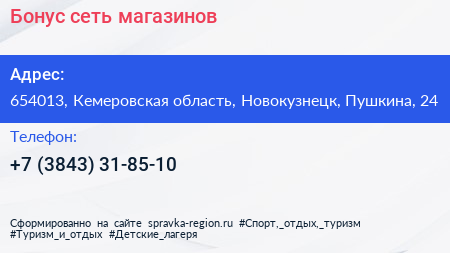 Бонус, сеть магазинов по адресу 654013, Кемеровская область, Новокузнецк, Пушкина, 24 в дальнейшем Организация, размещена в следующих категориях: