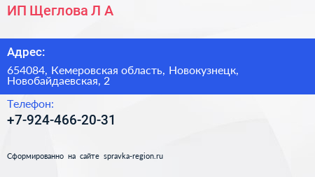 ИП Щеглова Л.А. по адресу 654084, Кемеровская область, Новокузнецк, Новобайдаевская, 2 в дальнейшем Организация, размещена в следующих категориях:
