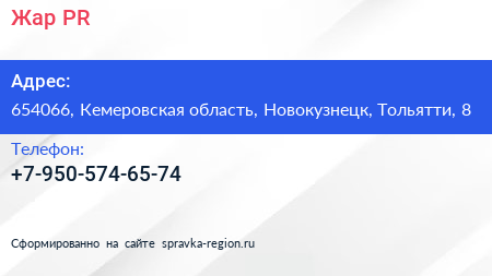Жар-PR по адресу 654066, Кемеровская область, Новокузнецк, Тольятти, 8 в дальнейшем Организация, размещена в следующих категориях: