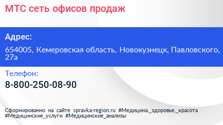 МТС, сеть офисов продаж по адресу 654005, Кемеровская область, Новокузнецк, Павловского, 27а в дальнейшем Организация, размещена в следующих категориях: