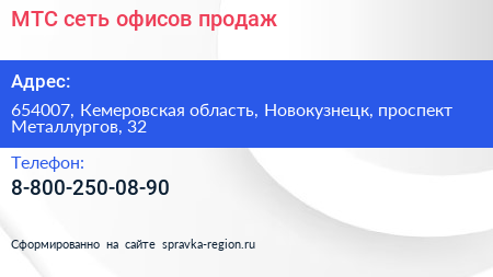 МТС, сеть офисов продаж по адресу 654007, Кемеровская область, Новокузнецк, проспект Металлургов, 32 в дальнейшем Организация, размещена в следующих категориях: