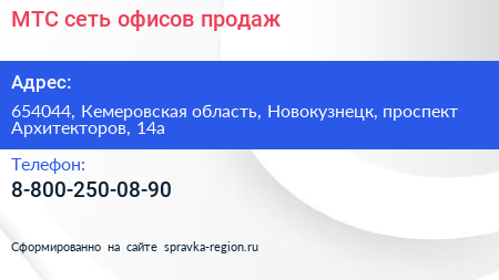 МТС, сеть офисов продаж по адресу 654044, Кемеровская область, Новокузнецк, проспект Архитекторов, 14а в дальнейшем Организация, размещена в следующих категориях: