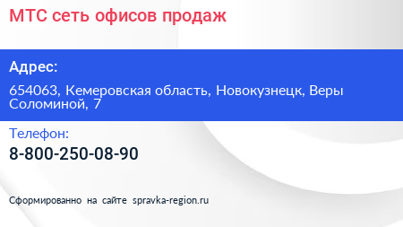 МТС, сеть офисов продаж по адресу 654063, Кемеровская область, Новокузнецк, Веры Соломиной, 7 в дальнейшем Организация, размещена в следующих категориях: