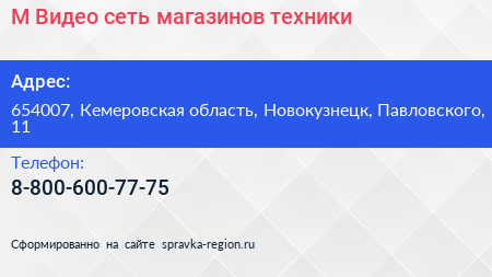 М.Видео, сеть магазинов техники по адресу 654007, Кемеровская область, Новокузнецк, Павловского, 11 в дальнейшем Организация, размещена в следующих категориях: