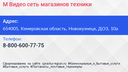 М.Видео, сеть магазинов техники по адресу 654005, Кемеровская область, Новокузнецк, ДОЗ, 10а в дальнейшем Организация, размещена в следующих категориях: