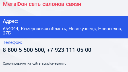МегаФон, сеть салонов связи по адресу 654044, Кемеровская область, Новокузнецк, Новосёлов, 27Б в дальнейшем Организация, размещена в следующих категориях: