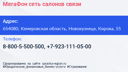 МегаФон, сеть салонов связи по адресу 654080, Кемеровская область, Новокузнецк, Кирова, 55 в дальнейшем Организация, размещена в следующих категориях: