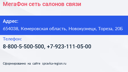 МегаФон, сеть салонов связи по адресу 654038, Кемеровская область, Новокузнецк, Тореза, 20Б в дальнейшем Организация, размещена в следующих категориях: