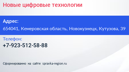 Новые цифровые технологии по адресу 654041, Кемеровская область, Новокузнецк, Кутузова, 39 в дальнейшем Организация, размещена в следующих категориях: