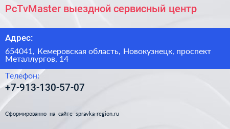 PcTvMaster, выездной сервисный центр по адресу 654041, Кемеровская область, Новокузнецк, проспект Металлургов, 14 в дальнейшем Организация, размещена в следующих категориях: