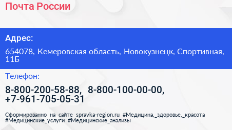 Почта России по адресу 654078, Кемеровская область, Новокузнецк, Спортивная, 11Б в дальнейшем Организация, размещена в следующих категориях: