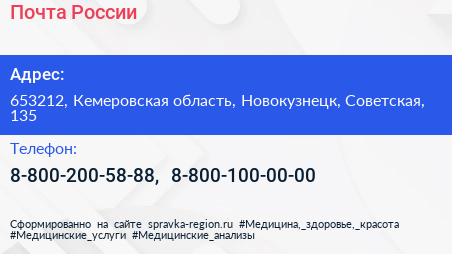 Почта России по адресу 653212, Кемеровская область, Новокузнецк, Советская, 135 в дальнейшем Организация, размещена в следующих категориях: