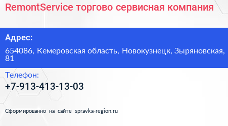 RemontService, торгово-сервисная компания по адресу 654086, Кемеровская область, Новокузнецк, Зыряновская, 81 в дальнейшем Организация, размещена в следующих категориях: